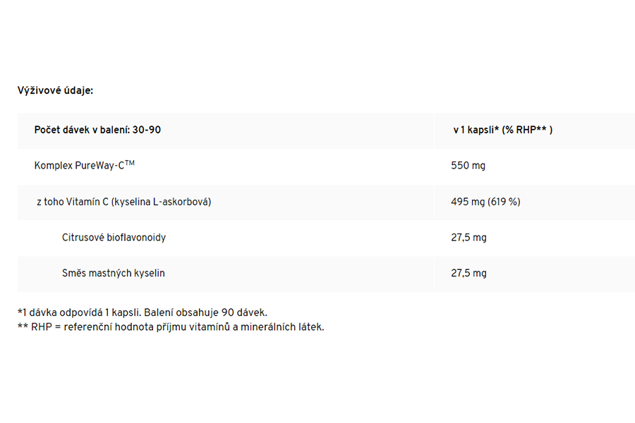 Komplex PureWay-CTM 550 mg [z toho Vitamín C (kyselina L-askorbová) 495 mg (619 %*), citrusové bioflavonoidy 27,5 mg, směs mastných kyselin 27,5 mg], obal kapsle 100 mg (hydroxypropylmethyl celuloza). *% referenční hodnoty příjmu vitamínů a minerálních látek.