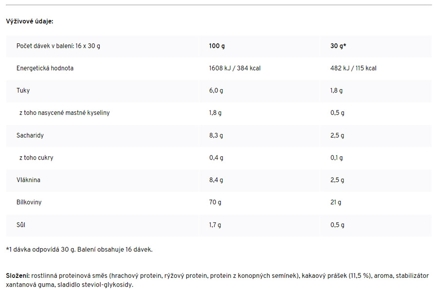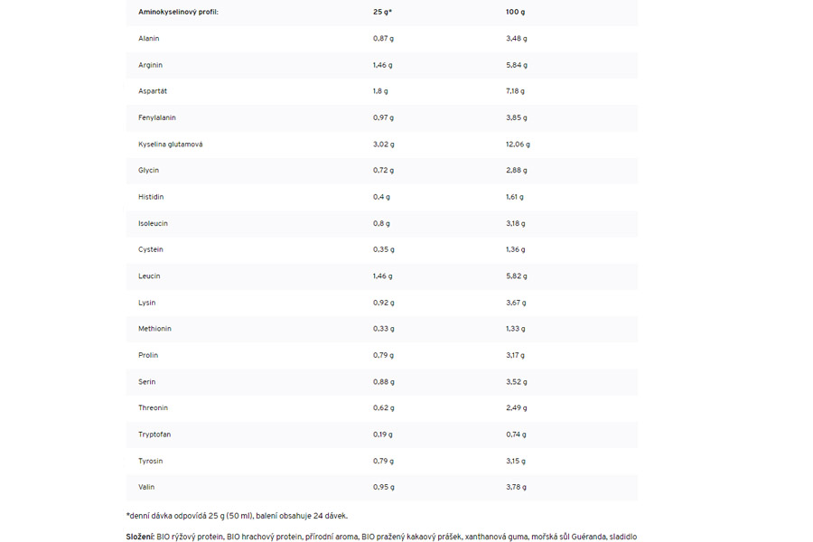 BIO rýžový protein, BIO hrachový protein, přírodní aroma, BIO pražený kakaový prášek/vanilka , xanthanová guma, mořská sůl Guéranda, sladidlo (steviol glykosidy)